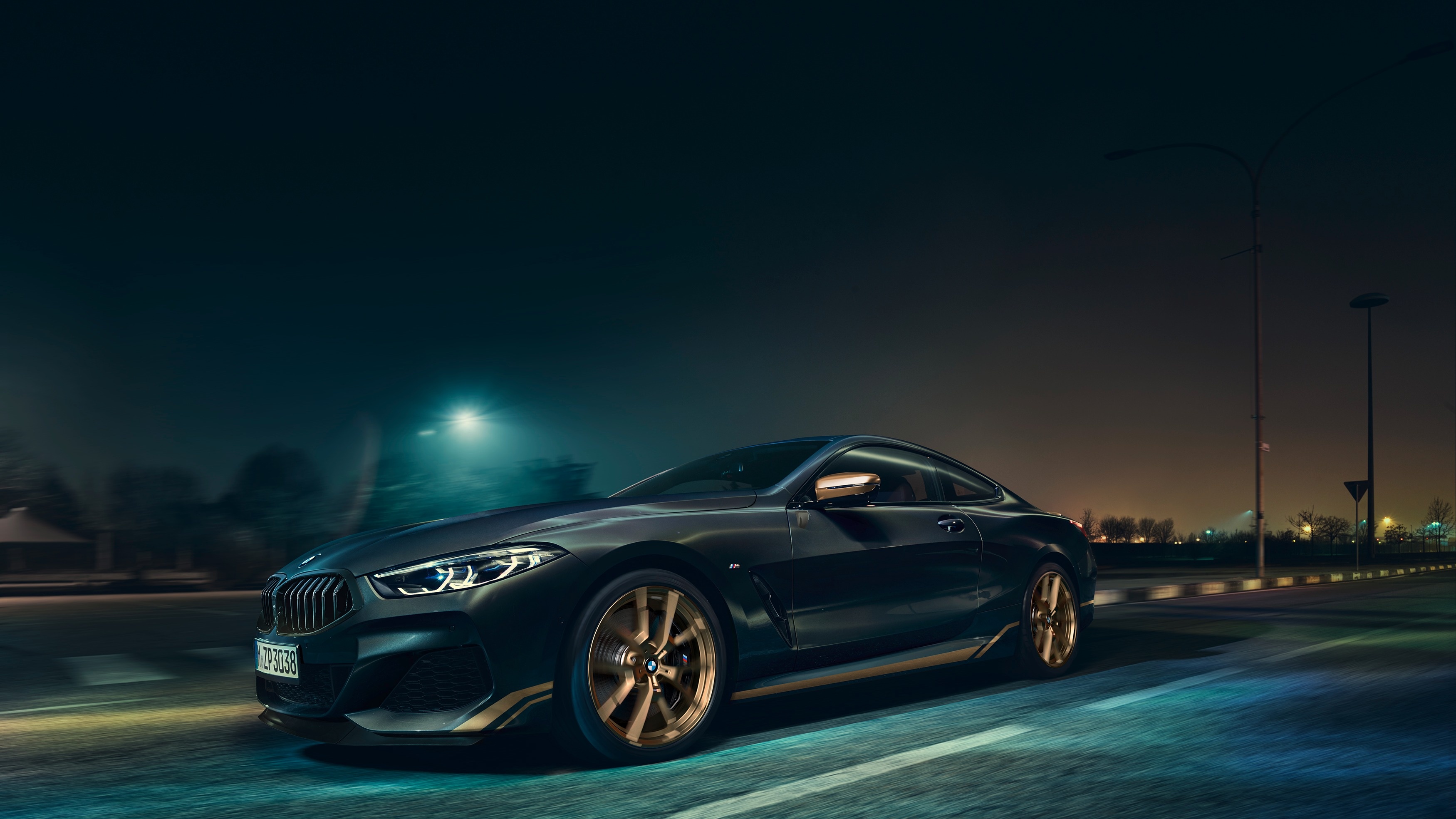 Золотистые акценты подчеркивают атлетизм и роскошь автомобиля: контрастные линии идут от переднего бампера через боковые пороги к заднему бамперу. Также золотистым цветом отделаны корпуса наружных зеркал, задний спойлер M (только на BMW 8 серии Coupe) и 20-дюймовые двухцветные колесные диски M.