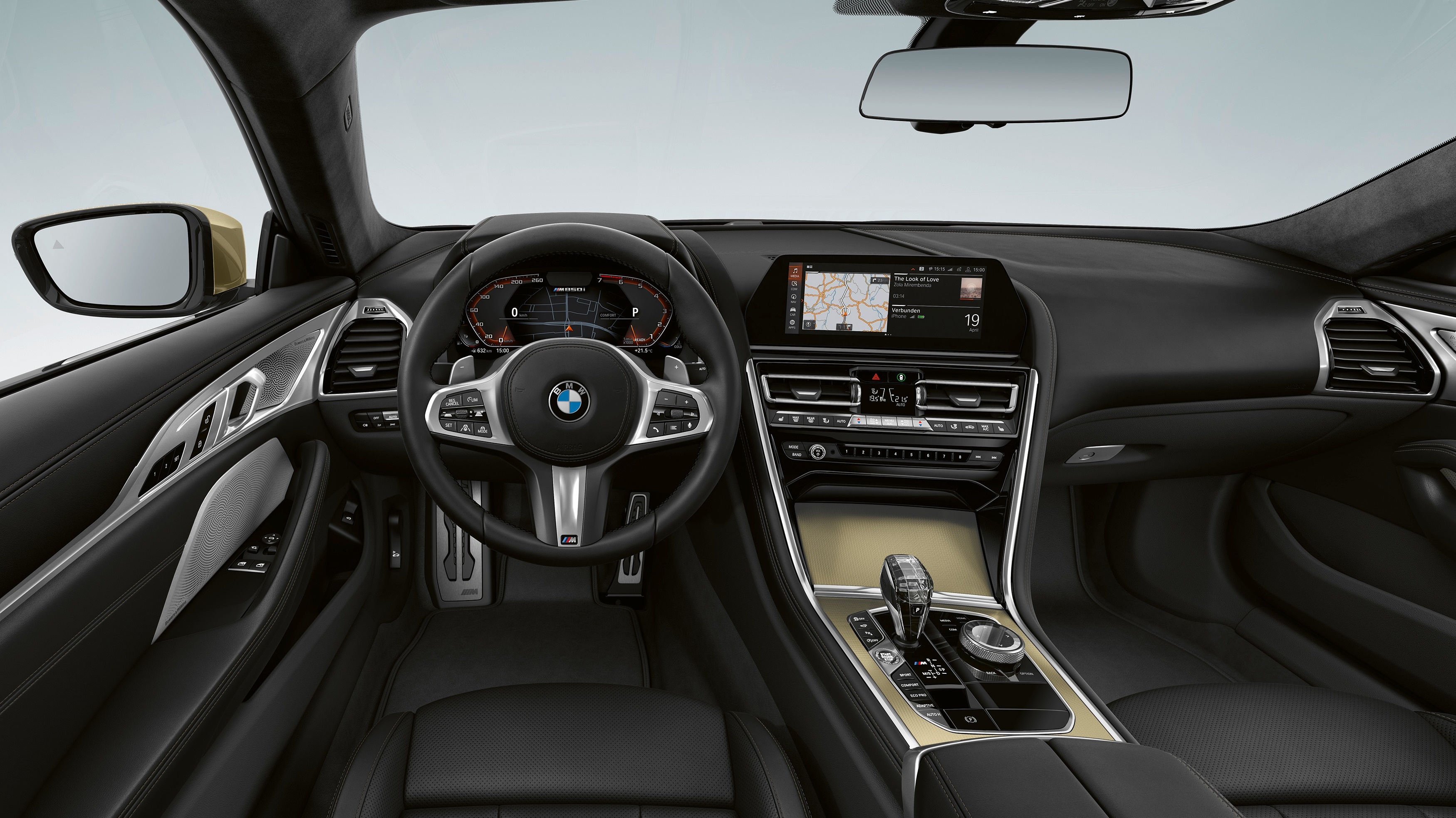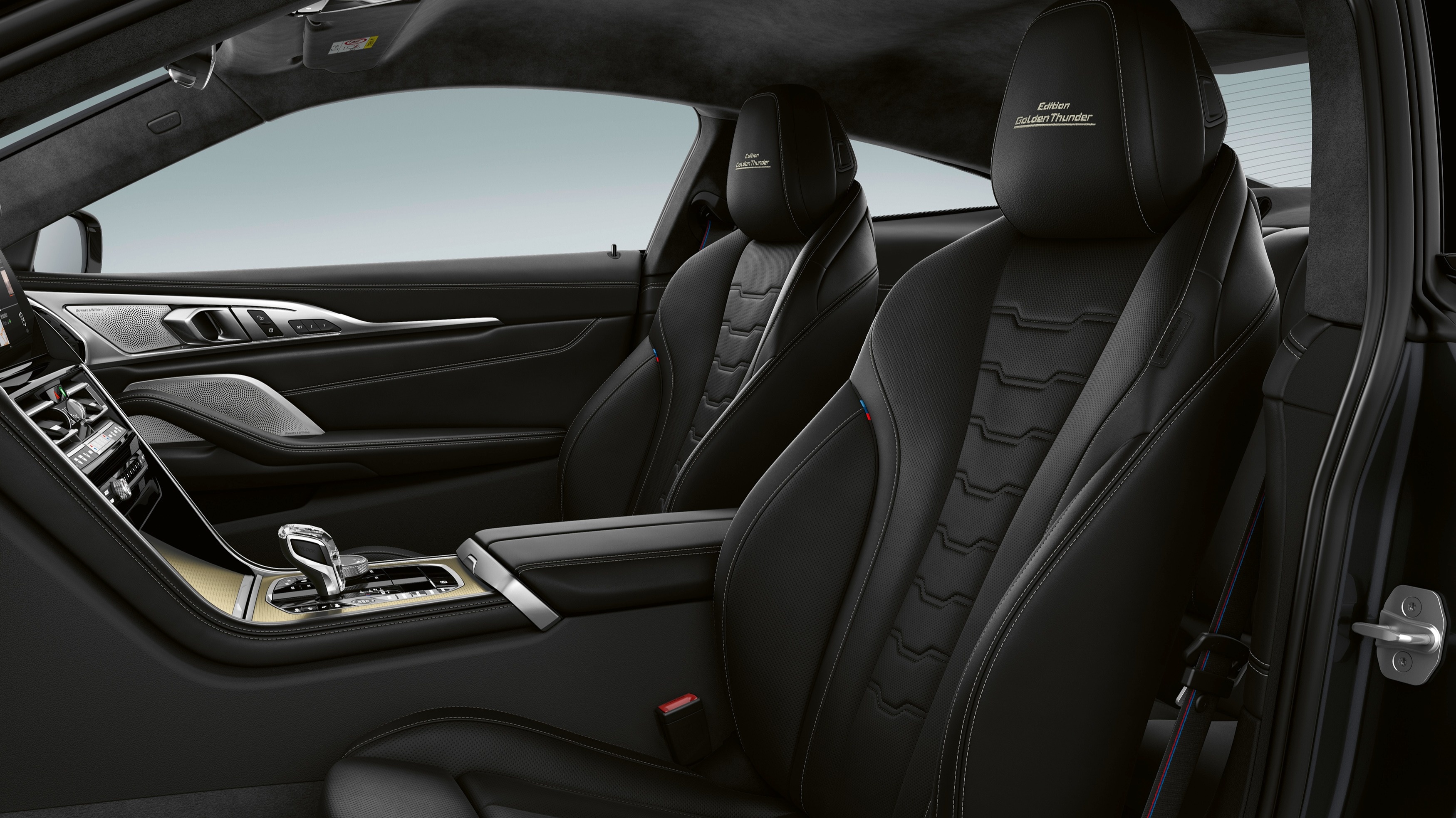 В салоне акцент сделан на сочетании спортивного духа и роскоши. Неповторимую атмосферу обеспечивают полная отделка кожей Merino черного цвета, вышивка эмблемы Edition Golden Thunder на подголовниках передних сидений, декоративные планки Алюминий Mesheffect и обивка потолка салона Alcantara «Антрацит» на BMW 8 серии Coupe и BMW 8 серии Gran Coupe.