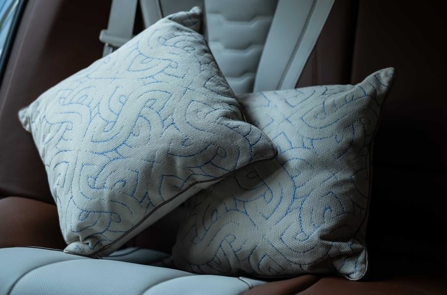 Обивка салона выполнена из кожи мериноса в двух цветах, а также дополнена вставками из лака с орнаментом. В комплекте с автомобилем идут особенные подушки и лоток ключей с орнаментов в классическом японском стиле. Подушки выполнены в традиционном стиле в технике плетения от фирмы Kano Sachi.